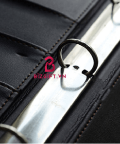 Bên trong bìa da in logo lưu trữ tài liệu dập logo ép nhũ trắng dùng còng 3 lỗ inox cứng cáp để giữ hồ sơ, và còn có rất nhiều ngăn nhỏ khác rất tiện dụng.