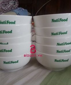 Chén sứ trắng in logo Nutifood xanh lá sử dụng công nghệ in lụa một màu hoặc nhiều màu được hấp nhiệt cẩn thận giúp logo, tên công ty thực sự nổi bật, thu hút khách hàng, dễ dàng gợi hớ đến kỷ niệm được nhận quà, tăng cường hiệu quả quảng bá cho doanh nghiệp.