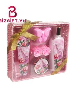 – Bộ sản phẩm gồm: Sữa tắm, sữa dưỡng thể, thanh lọc cơ thể, fizzer hình con bướm & hoa xà phòng hình hoa hồng.