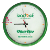 Đồng hồ treo tường in logo viền xanh phối bạc và có viền kim loại làm điểm nhấn. Mặt đồng hồ bằng số dễ nhìn, bên trong in tên, logo, và thông tin của doanh nghiệp được in trực tiếp trên mặt đồng hồ, dùng kỹ thuật in offset nhiều màu để thương hiệu của doanh nghiệp luôn được nổi bật và mọi người chú ý đến.