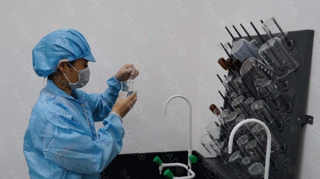 Nhân viên IMADO đang kiểm chất lượng sản phẩm gel rửa tay khô
