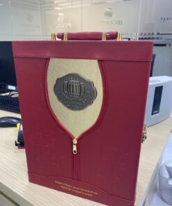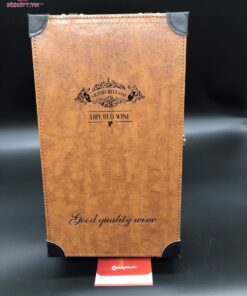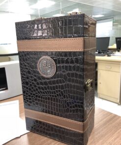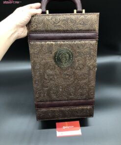 Bên dưới là hộp quà Tết da cao cấp có thiết kế đơn giản kiểu hộp chữ nhật đứng, có quai xách, trông hộp quà thật giản dị nhưng cực kỳ tinh tế và toát lên nét cao cấp. Hoa văn bên ngoài tượng trưng cho hoạt tiết của hoàng gia châu Âu, đẳng cấp, phù hợp với giới thượng lưu.